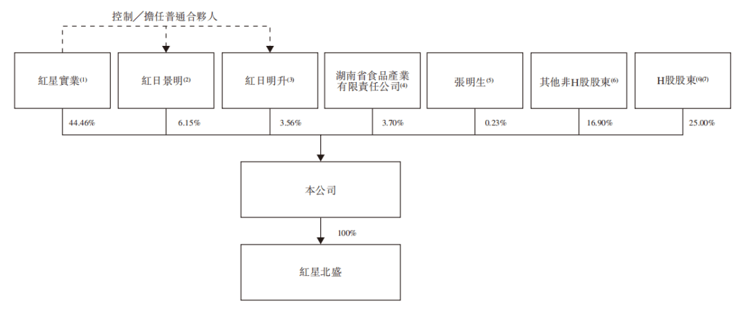 分析计较,红星实业、红日景明、红日明升及红星核心合计节制公司已刊行股本约70。97%。此外,湖南省食物财产无限义务公司正在上市前持股约4。85%,施行董事张明生小我持股约0。3%。