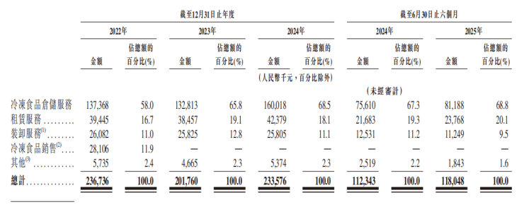 截至2025年6月30日止六个月,红星冷链实现收入约1。18亿元人平易近币,较2024年同期的约1。12亿元增加约5。1%;期内利润约3968万元人平易近币,较上年同期约4127万元下降约3。9%,净利率约33。6%。从收入形成看,红星冷链次要依托冷冻食物仓储办事、门店租赁及拆卸办事三项营业。2025年上半年,冷冻食物仓储办事收入约8119万元人平易近币,占比约68。8%;门店租赁办事收入约2377万元,占比约20。1%;拆卸办事收入约1125万元,占比约9。5%。从数据上看,公司冷冻食物仓储办事收入占比全体连结正在六成以上,自2023年起不变正在65%上方,是最焦点的收入来历,门店租赁取拆卸营业供给配套现金流。